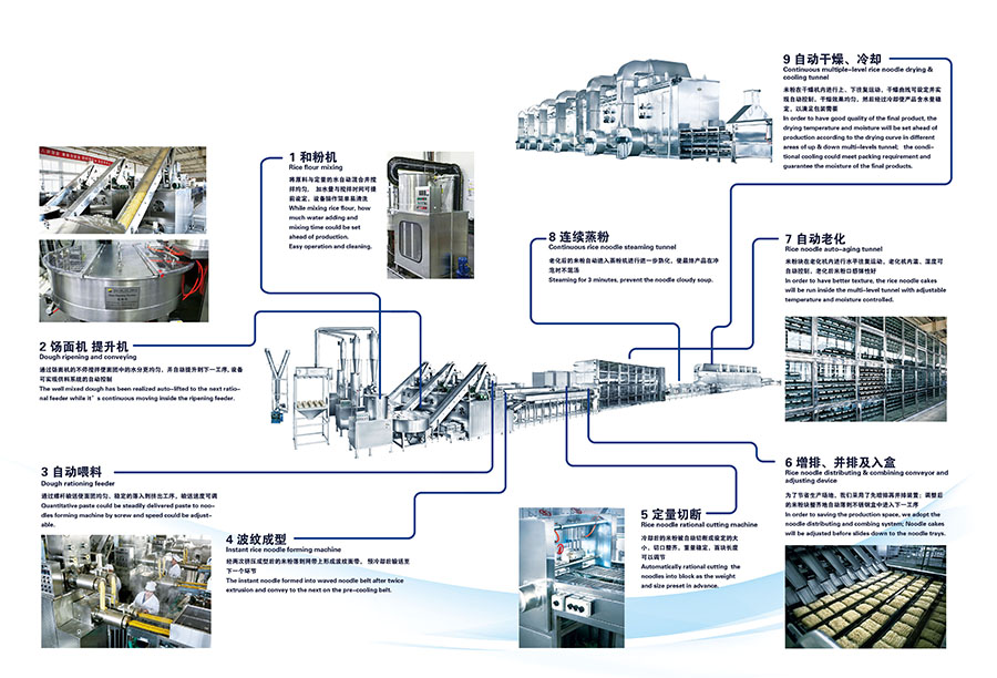 冷卻后的米粉被自動(dòng)切斷成設定的大小,切口整齊,重量穩定,面塊寬度及長(cháng)度可以調節;